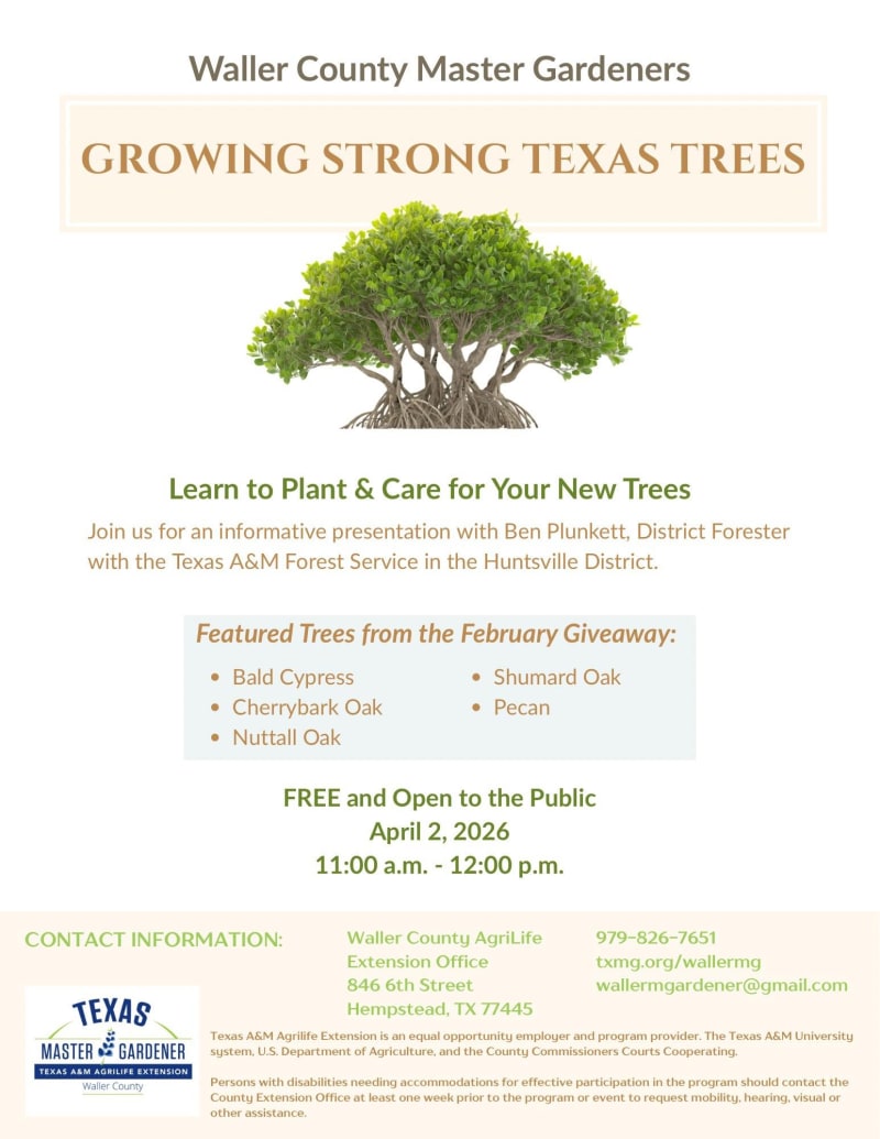Welcome to the Waller County Master Gardeners’ monthly e-Blast keeping you up-to-date with educational programs and events going on during the month plus links to timely AgriLife Horticultural articles. All programs are supported by the Waller County Master Gardener Association through the Waller County AgriLife Extension Service.