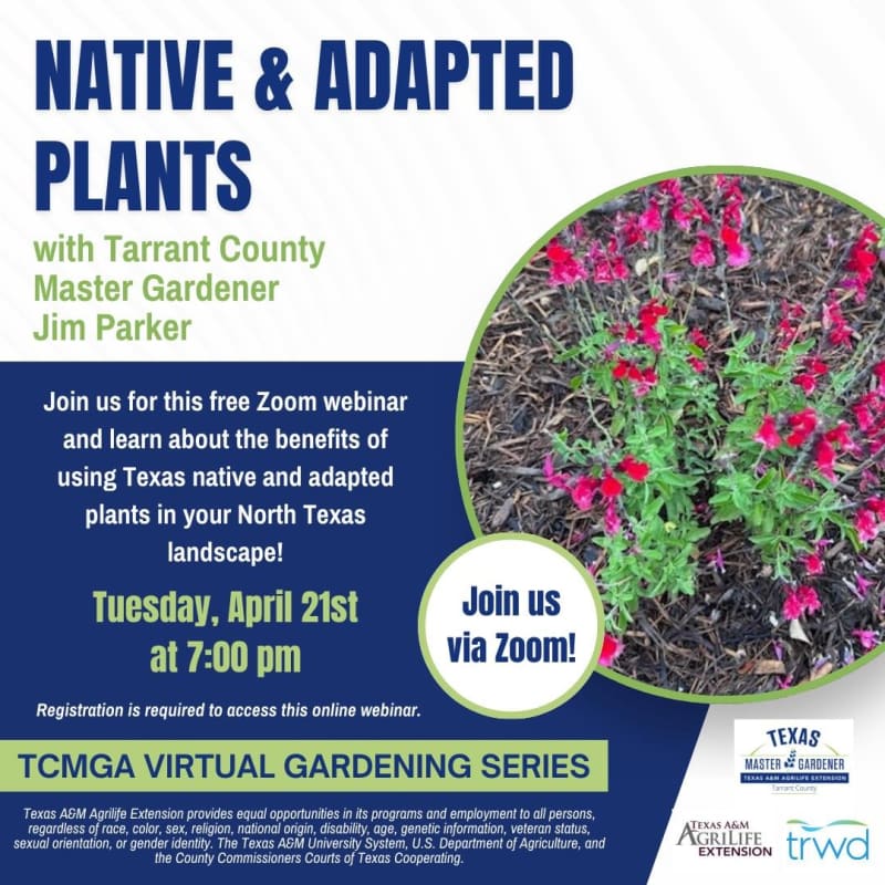 Native & Adapted Plants: April 21st, 7:00pm, Speaker: Tarrant County