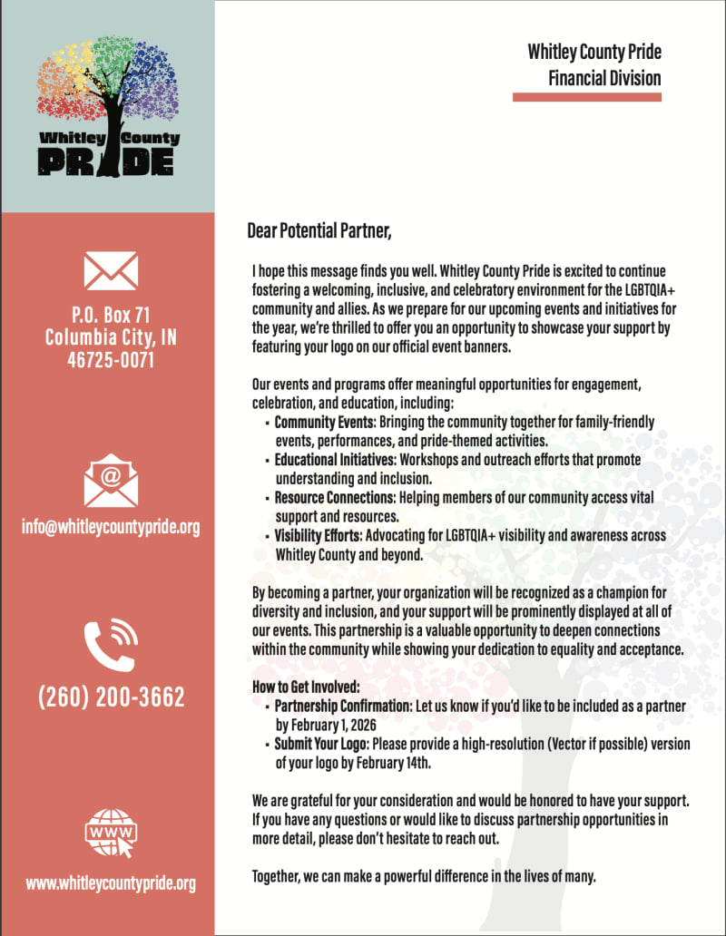Our partners aren’t just names on a list; they are the lifeblood of our mission. They help fund inclusive programs, create safe spaces, and bring visibility to the voices that need it most. Every dollar, every hour volunteered, every word of encouragement builds the foundation for a stronger, more united Whitley County.