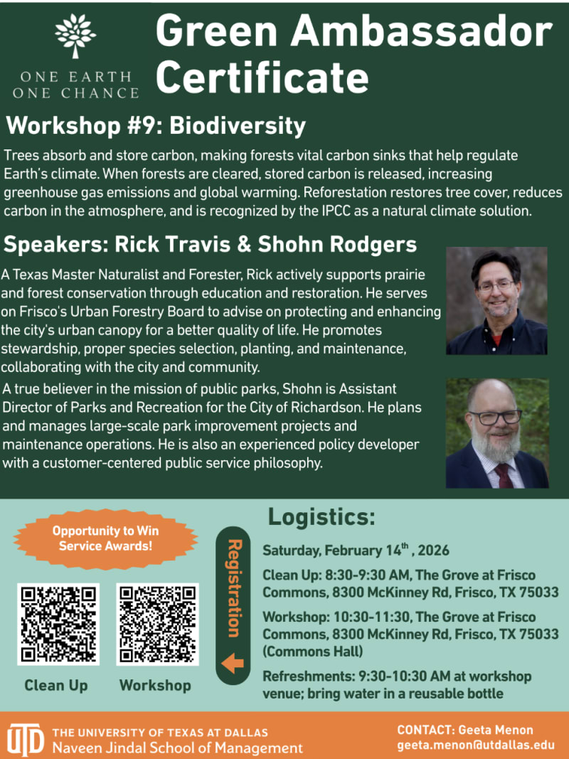 Join OEOC at The Grove at Frisco Commons for the ninth Green Ambassador workshop on Forests and Wildlife, featuring experts Rick Travis and Shohn Rodgers exploring nature-based climate solutions.