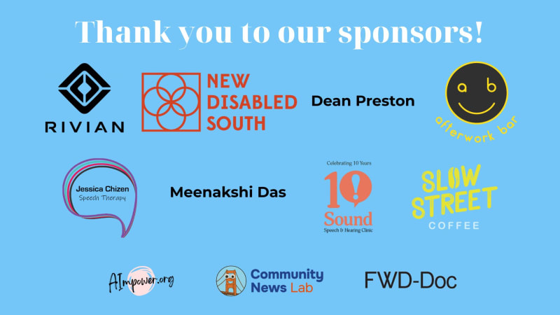 Special thanks to our sponsors, partners, crew, and volunteers: Eliot Goldstein, Jon Warfield Harrison, Angie Lara, Rivian, The Bird/Afterwork Bar, New Disabled South, AImpower.org, Slow Street Coffee, Sound Speech & Hearing Clinic, National Stuttering Association, Jessica Chizen Speech, Community News Lab, FWD-DOC, Meenkashi Das, Dean Preston, Dom Kelly, Issac Bailey, Jim Lebrecht, Nina G, Misha Velasquez, Stanley Lui, Tessa Andrade, Patricia Chupkov, Dan Chupkov, Julie Fogh, Krithi & Swathy Manavalan, Phoenix, Kyle Smeallie, Khiry Shank, Ina Lilac, Sheena Brevig, Andrew Seigner, Jim Lebrecht, Keenan Goldin, Sari Grunis, Andrew Rogge, Jesse Vasquez, Cynthia Chin, Christina Chin, Sarah Nelson, Traka Lopez-White, Christopher Caulfield.