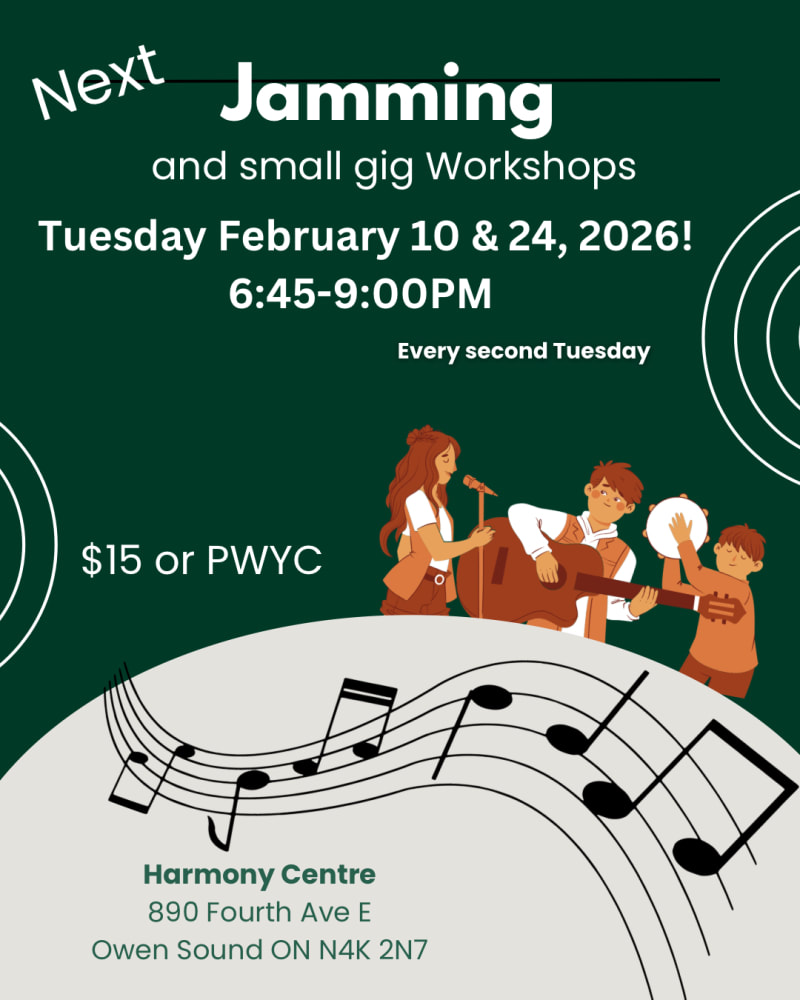 The Queen’s Bush Bluegrass Club invites all pickers, singers and supporters to our regular Jam Sessions at the Harmony Centre, Owen Sound. We meet in the round and rotate the lead so everyone has a turn to participate in a friendly and welcoming environment.