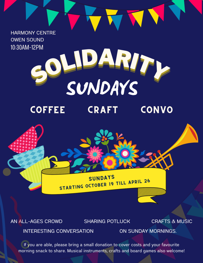 Solidarity Sundays are made possible through donations. If you are able, please bring a small donation to cover costs or a potluck snack. Crafts and board games are also welcome! Bring a musical instrument if you'd like to join the jam circle (beginners welcome). The room has a wheelchair ramp and is fully accessible. See you there!