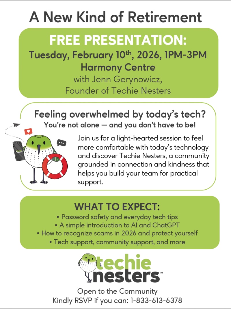 And one quick event-specific plug because it warms my heart…check out the poster below from Techie Nesters; it’s their second visit to Harmony Centre, offering free technology workshops to people 55+. Technology doesn’t have to be intimidating. Techie Nesters will demonstrate some wonderful tools for safety and connection.