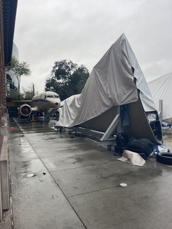 In 2025, DC-3 N760 was returned to Exposition Park in several portions, with the outer wing panels, ailerons, and propellers being transported in the spring, while the remainder of the aircraft, including the fuselage, center wing section engines and nacelles, and the tail surfaces, were all transported as one unit. Currently, DC-3 N760 “Spirit of Seventy-Six” remains disassembled, sitting in what was part of the museum’s outdoor patio table area. It sat with two other aircraft, Grumman F11F-1 Tiger BuNo 138608, which has since been installed in the new Samuel Oschin Air and Space Center building, and Northrop T-38A Talon 59-1603/NASA 963, which was also loaned to the Western Museum of Flight.