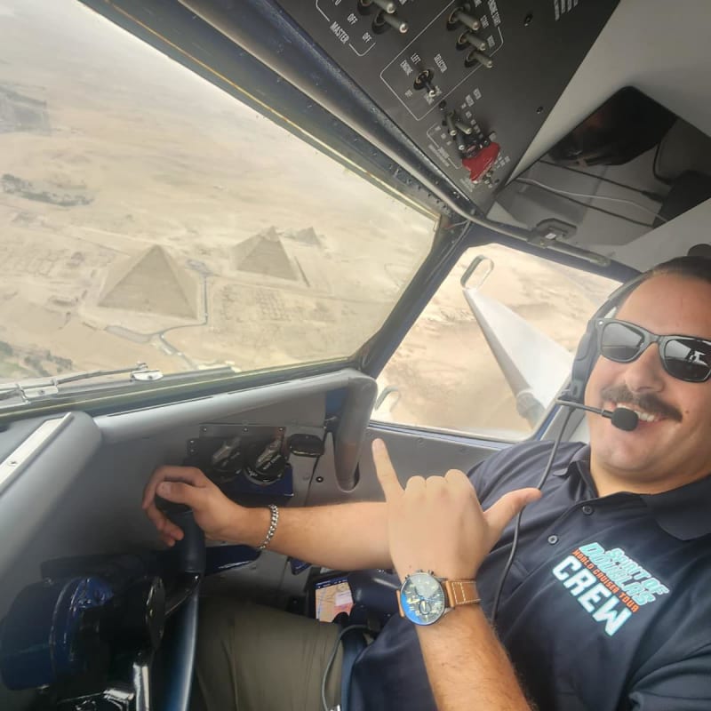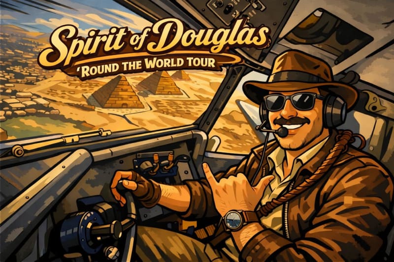 We think the Spirit of Douglas crew is having an absolute blast on their global journey! Huge thanks to Society member Chris Hicks for the brilliant idea to recreate an epic shot originally captured by fellow member Nick Kanakis—flying over one of the Seven Wonders of the World, the Pyramids! Check out this amazing photo!