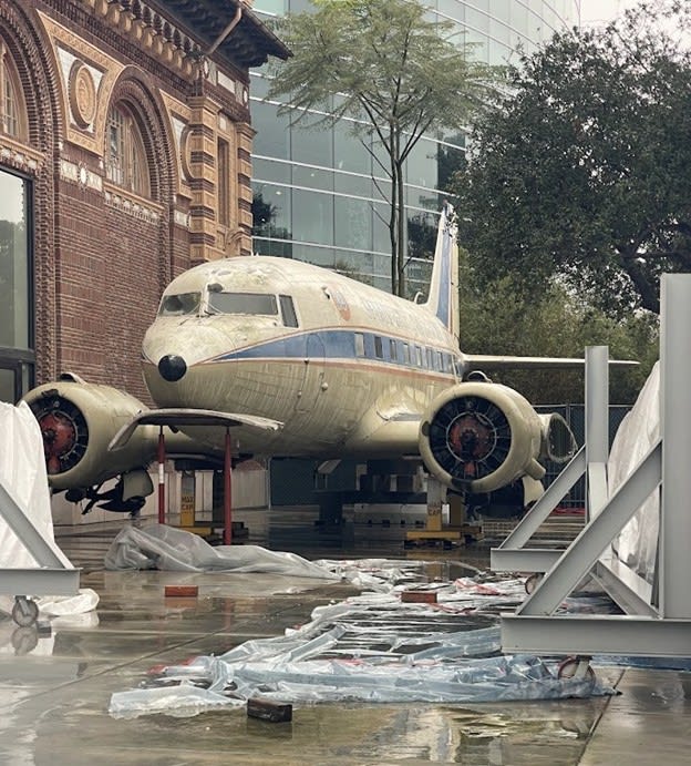 Located in the former LAX Imperial Terminal on the south side of one of the world’s busiest airports, the museum offers visitors a remarkable glimpse into Los Angeles’ aerospace history, with exhibits on the evolution of LAX from its establishment in 1928 as Mines Field to its present-day status as a worldwide hub for travel and commerce, former and current airlines, and local aerospace manufacturers. The Flight Path Museum prided DC-3 N760 as being the sole aircraft on its premises, and offered guided tours of its interior to visitors until the COVID-19 pandemic caused the interior tours to cease. On most days, the DC-3 would be facing Boeing 747-400Fs of Kalitta Air having cargo loaded and unloaded, and be in view of departing airliners and cargo aircraft. By that point, however, the exterior of the aircraft began to show its age yet again, and around this time, the California Science Center began finalizing the design work on the upcoming Samuel Oschin Air and Space Center.