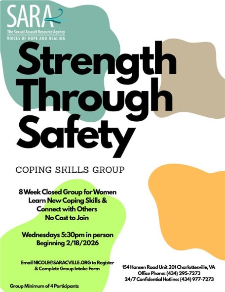 154 Hansen Rd., Suite 201, Charlottesville, VA 22911 24-hr Hotline: (434) 977-7273 Office: (434) 295-7273 © 2026 SARA - Sexual Assault Resource Agency. All rights reserved.