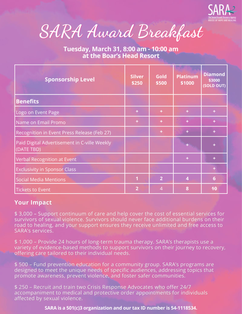 Sponsors receive recognition at the event and in SARA communications, while making a powerful statement of support for survivor-centered care. Together, we can celebrate impact, uplift leadership, and ensure survivors continue to receive the services they deserve.