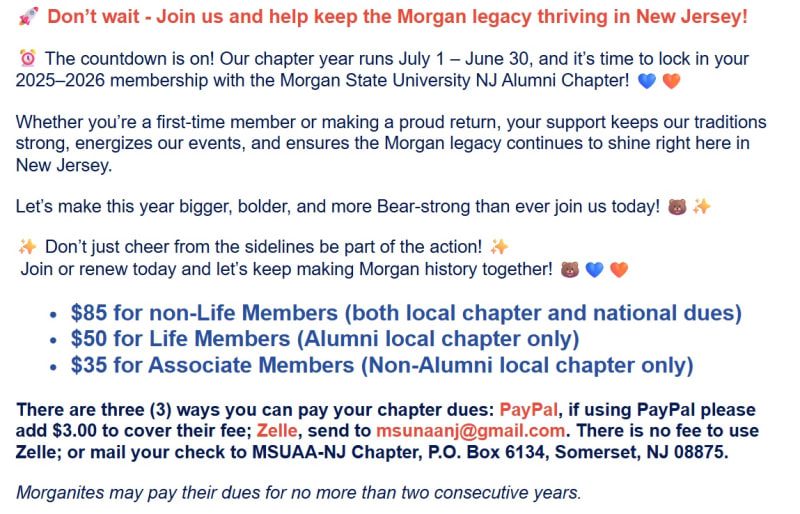 Now’s your moment to pay it forward and keep the Morgan Bears spirit roaring in New Jersey! 🐻💙 Join a Morgan State University NJ Alumni Chapter committee and put your energy, ideas, and skills to work shaping future generations, supporting current students, and making a real impact.