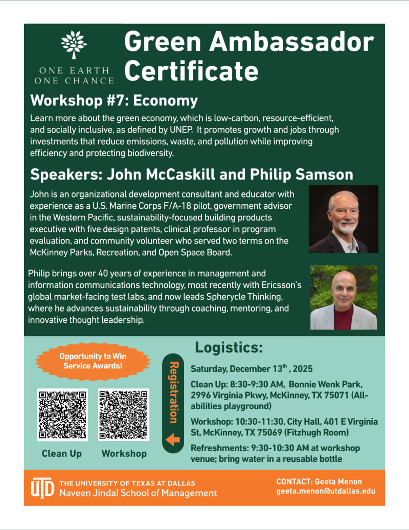 Join us December 13th at Bonnie Wenk Park for a cleanup and Green Ambassador workshop, where Prof. John McCaskill and Philip Samson will unpack how the economy drives environmental sustainability and the path to a greener future.