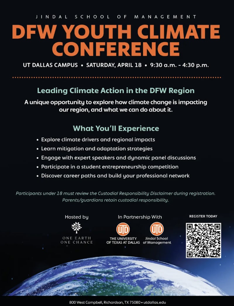 One Earth One Chance and UT Dallas are hosting this in-person event on April 18, 2026, at UTD JSOM, giving high school and college students a unique chance to explore climate change and its impact on the DFW region.