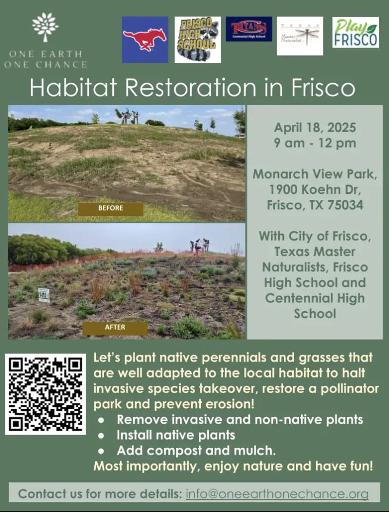 On April 18, 2026, 9 AM–12 PM, One Earth One Chance partners with Blackland Prairie Master Naturalists, Frisco High, and Centennial High to plant native perennials and grasses at 1900 Koehn Dr, Frisco, TX. Help restore pollinator habitats, remove invasive species, and support urban wildlife.