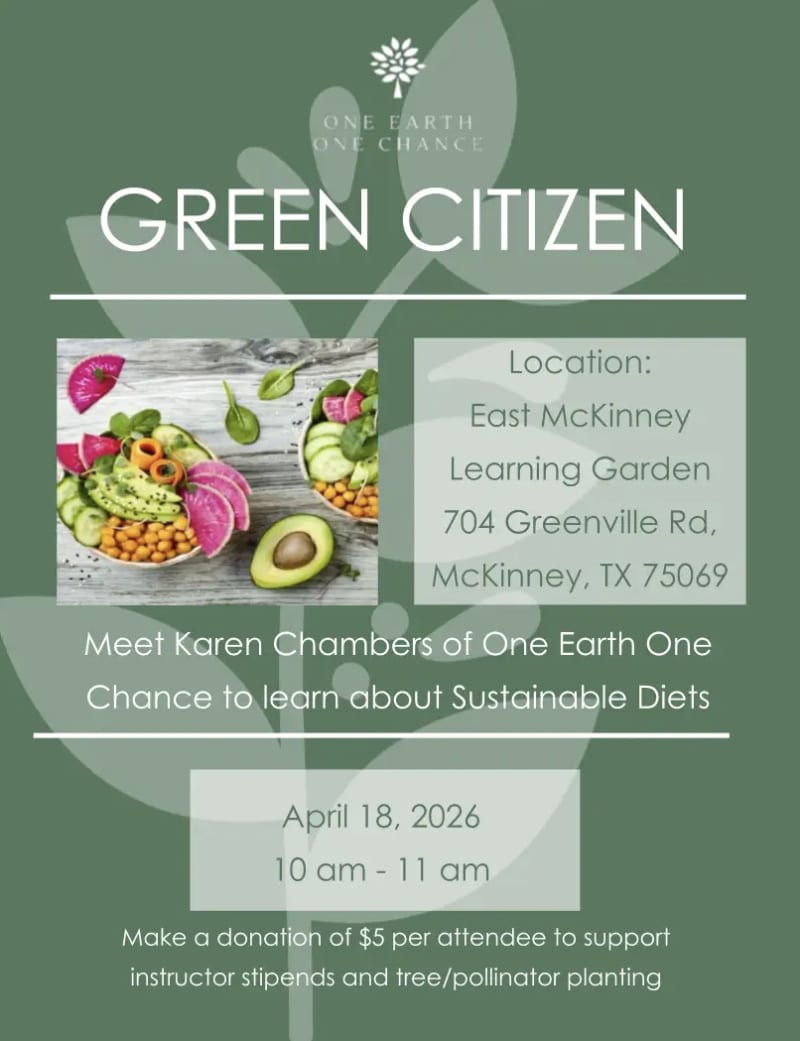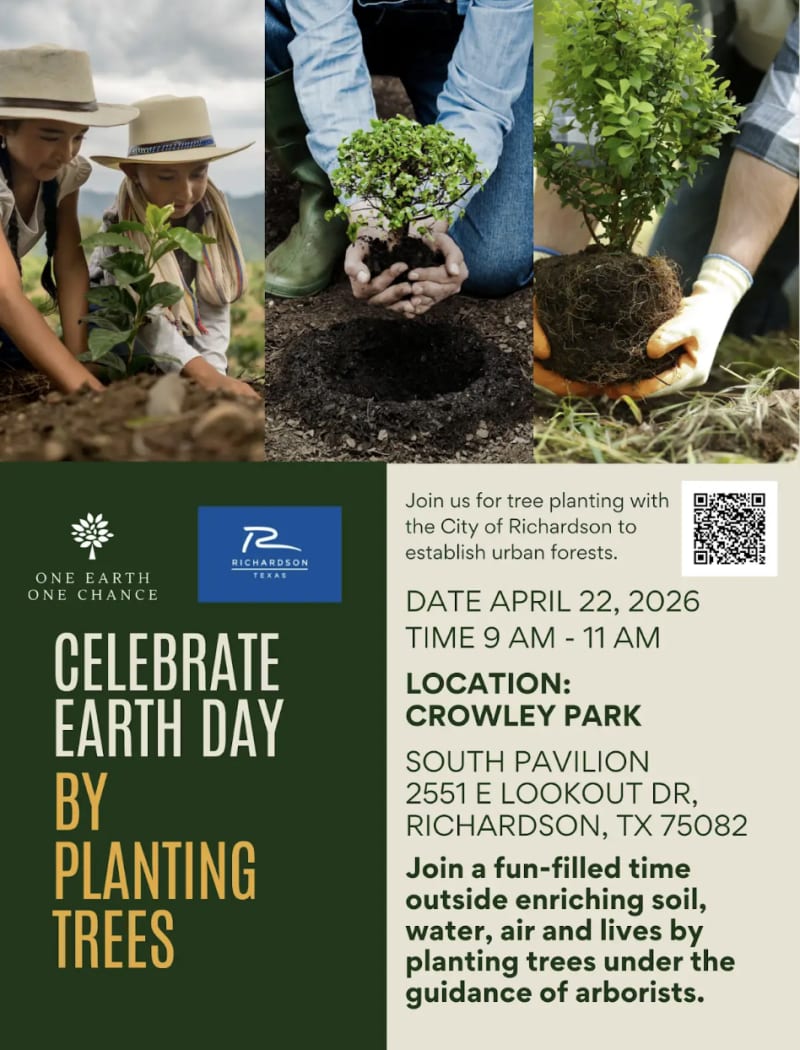 Join One Earth One Chance and the City of Richardson on April 22, 2026, 9–11 AM at Crowley Park, South Pavilion to plant 50 trees and celebrate Earth Day! Help dig, plant, and mulch while making a lasting impact on the local environment.